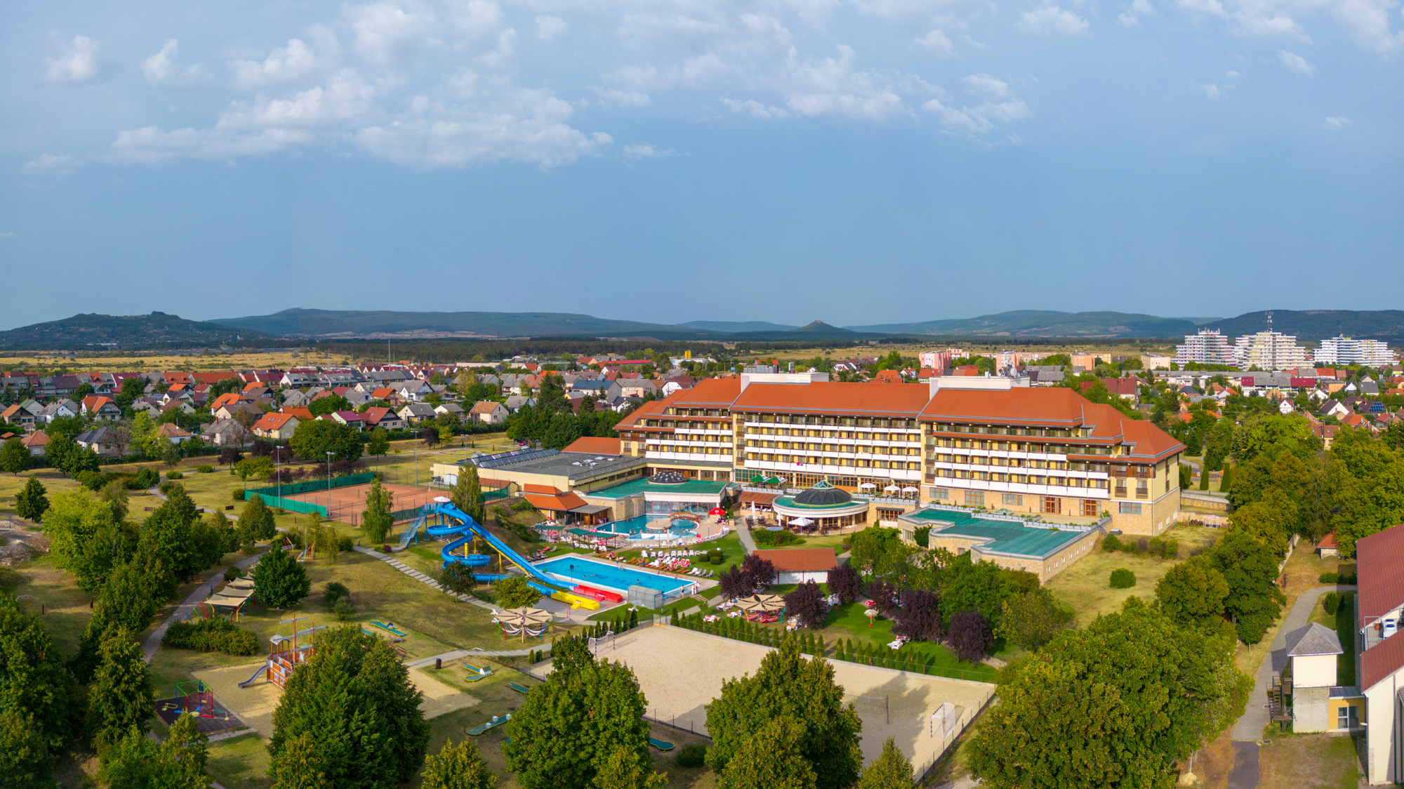 Wellness sziget: termálvizes medence, élményfürdő, kerti úszómedence és gyermek medence szezonálisan, finn szauna, bioszauna, infraszauna, gőzkamra.